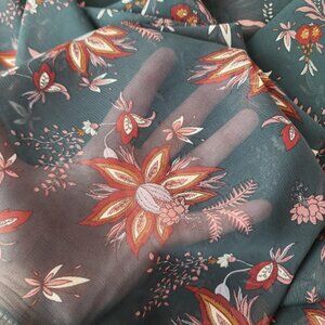 Dark green & rust floral print open front sheer kimono style duster with cream fringe trim