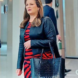 Crocodile/ Alligator like embossed shoulder bag. Dsrk red color. 1 outer zippered pocket. 1 Inner zippered pocket and 1 inner open pocket. 15" across, 10.5 high, 4.5 wide. Studs on bottom for rising above placement on wet surfaces. Ana Gasteyer's character wore a bag similar in the current TV show "American Auto". Brand new.