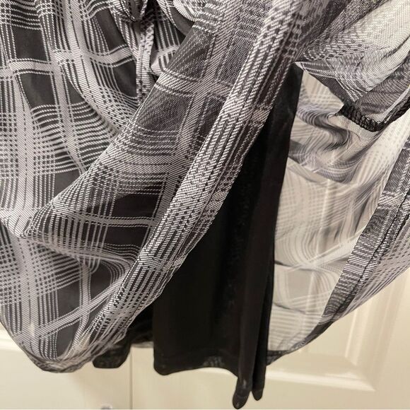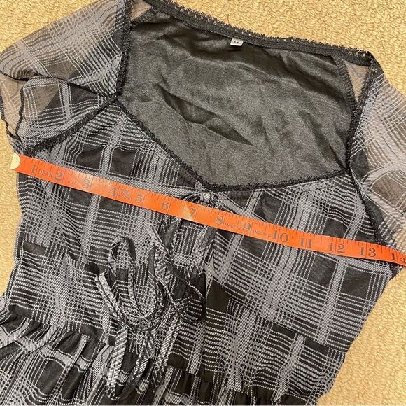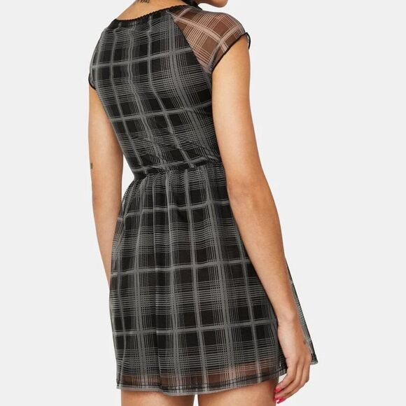 Channel goth coquette edgy Y2K/90s vibes with this trendy plaid mini dress in black and grey. Featuring a sheer design with cap sleeves, a decorative tie at the neckline, and a flattering fit n' flare silhouette, this piece is both playful and versatile.