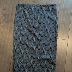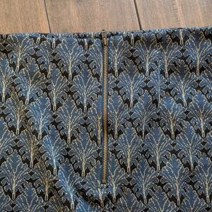 Chic midi skirt with intricate blue and gold design. Perfect for stylish outings.