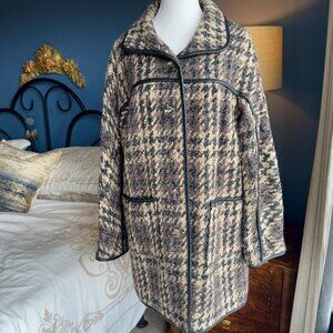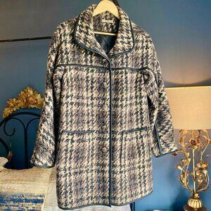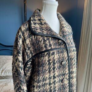 Darling London brown, black, and tan plaid houndstooth midi length duffel coat. Button closures, loose boucle knit, black faux leather trim and piping, lined. Size L, looks great on a M as well. Bust measures just over 19.5 inches laying flat, length from shoulder to hem is 32 inches. Excellent used condition. Cat friendly, nonsmoking home.