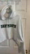 White cropped hoodie with Dartmouth logo. Features a drawstring hood.