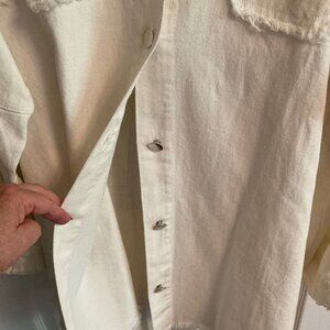This is brand new, never worn and in perfect condition with tag. It is 100% cotton with raw hems, has two pockets on the front and silver buttons. The lettering on the back is flocked.