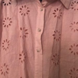 This is a peach coloured 100% cotton, button-up top, which can be worn buttoned up, or open. It is brand new, never worn, but tags have been removed. Eyelet design, sleeves are to elbow.