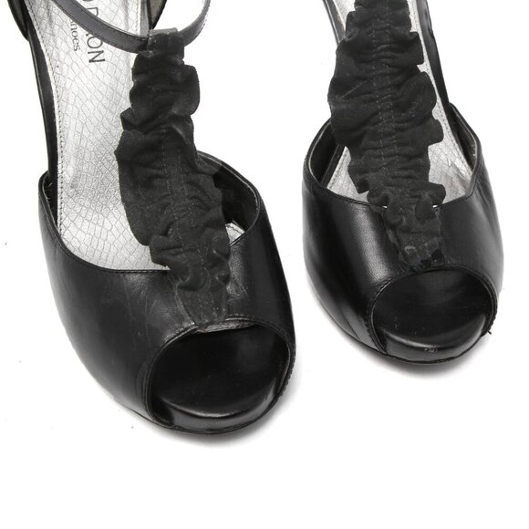 David Dixon Leather T-Strap Platform Peep Toe Pump Ruffle Vamp Stilettos Black