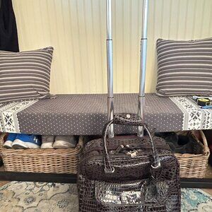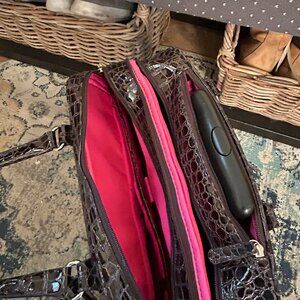 David Jones Crocodile embossed rolling bag with pink lining. Excellent condition with some minor wear on underside. Bag is 16" H x 16" W x 8" D. Great for business/overnight travel.