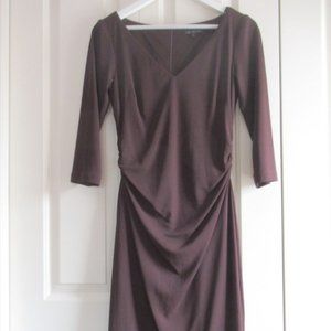 This David Meister dress is a knit sheath with draped burgundy coloured fabric in the front and tucked fabric at the back. It is fully lined and has 3/4 length sleeves. The attractive neckline is a wide V-shaped style perfect for necklaces. This dress has a tag on an inside seam that identifies it as a US size 8. It is new without sale tags and has never been worn.