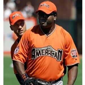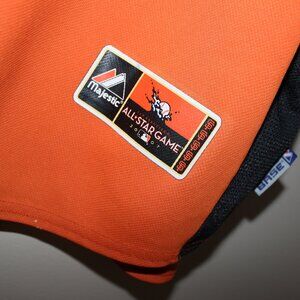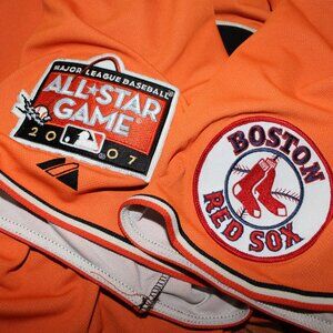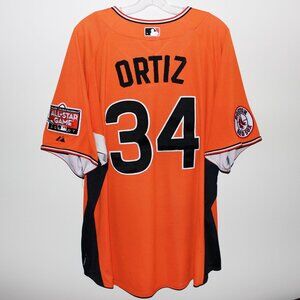100% official licensed SAN FRANCISCO MLB 2007 ALL-STAR game baseball jersey shirt, bearing the name and number of "Big Papi" David Ortiz. Manufactured by Majestic. The size tag has faded, but I measured 32" from armpit to armpit across the chest at the widest part. Made in Korea original. No time for Far East fakes or modern reproduction bollocks. This is the real deal.