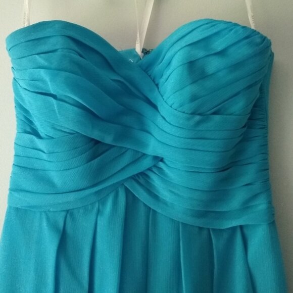 David's Bridal strapless dress with sweetheart neckline and structured bodice. Gathered pleated fabric on bust and skirt. Layered ruffled fabric on skirt. Hidden back zipper. Signature Malibu blue color. Polyester.
