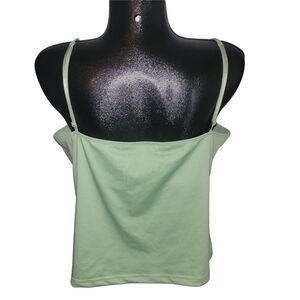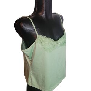 This elegant cami top features a delicate lace trim, perfect for adding a touch of sophistication to your wardrobe. The soft green color is both refreshing and versatile, ideal for any occasion. Has adjustable shoulder straps.