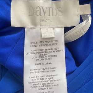 Very flattering David’s bridal dress. Worn once, like new condition. The best part, you can actually wear a bra with this dress! Wasn’t hemmed to far I’m 5’5” and it was hemmed to wear with 3 inch heels.