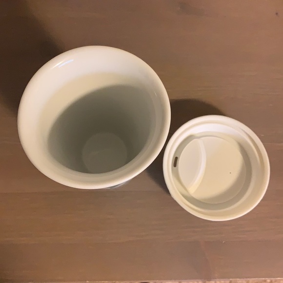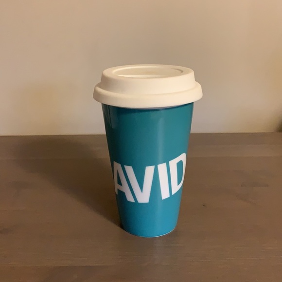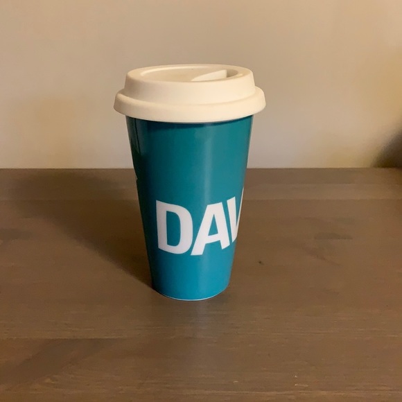 New with stickers David’s Tea teal and white ceramic to-go mug with white silicone lid.