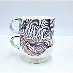 The Davids Tea Geometric Wave Design Mugs are a stackable set of two ceramic mugs. They are distinguished by their unique design, featuring a geometric pattern of purple waves. The mugs are designed with a "stemmed" base, which allows them to be stacked on top of one another, making them ideal for space-saving storage. The set's aesthetic combines a modern, geometric motif with a practical, stackable form. These mugs are a part of a popular line of tea and coffee ware offered by Davids Tea, known for its stylish and functional designs.