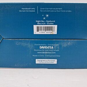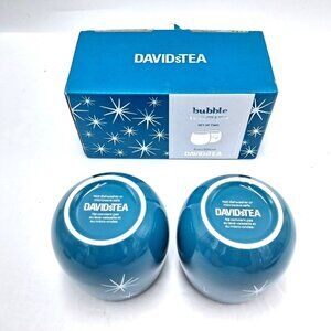 The Davids Tea "Night Sky Star Burst" teacups are a set of two ceramic "bubble" teacups, each with a 6-ounce capacity. The "bubble" shape refers to their rounded, bowl-like design. The cups feature a decorative pattern of starbursts and celestial motifs on a dark, night-sky-colored background. Their small size makes them ideal for tasting fine teas. These teacups are a collectible item for fans of Davids Tea and those who appreciate unique and aesthetically pleasing teaware.