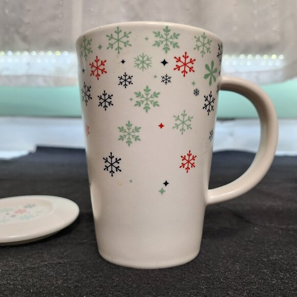 Davids Tea Perfect Snowflake Mug with Lid. Lovely Holiday or Christmas stylized snowflake pattern on creamy white mug with Mint coloured Interior. Red blue and mint coloured snowflakes. Has a very Mid century vibe to it. No strainer included. Excellent preloved condition overall.