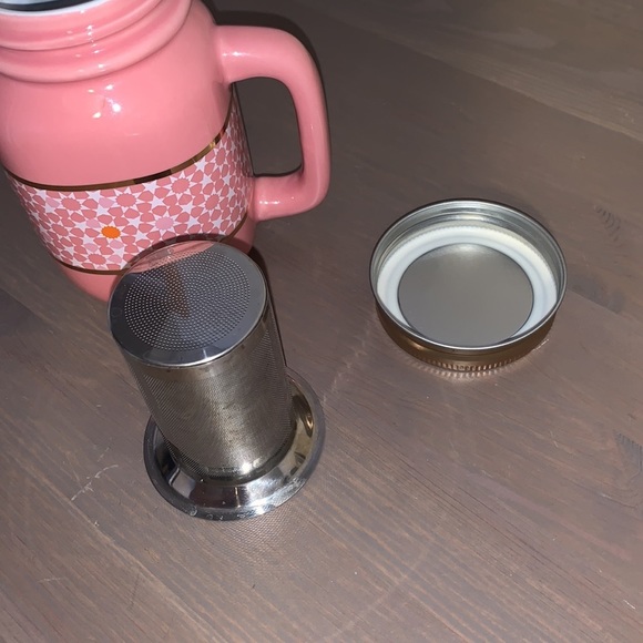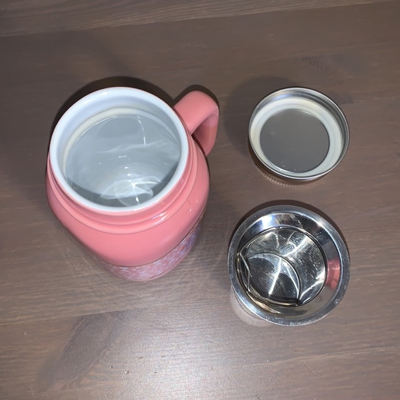 VGUC David’s Tea pink, white, and gold floral print ceramic to-go cup with strainer and lid.