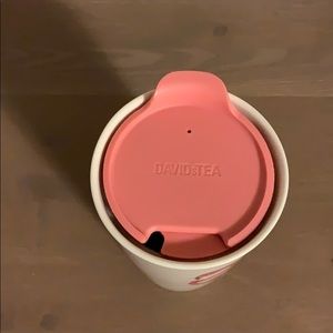 EUC David’s Tea pink and white flamingo ceramic to-go cup.