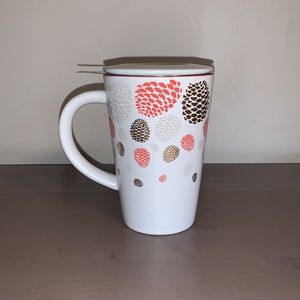 EUC David’s Tea metallic pinecone print white ceramic mug with strainer and lid.