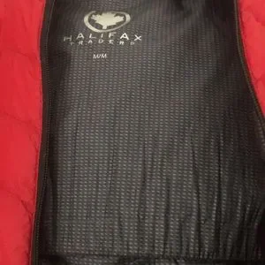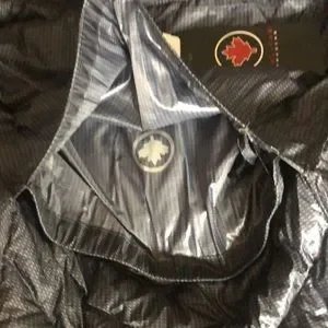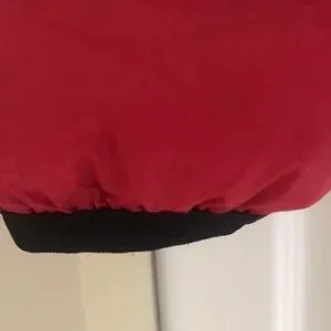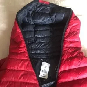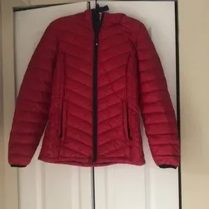 2 pockets with zipper on the front and 2 pockets inside . Had a hood and zipper going all the way up to the top of the hood.