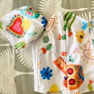 These one of a kind corset tops are fun and colorful. they are great for any day but perfect for the day of the dead and Halloween! It has an ajustable lace up back so it can fit XS to XL.