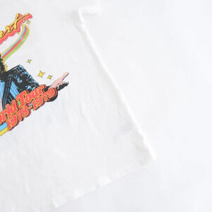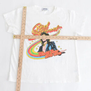The classic design features bold tour graphics, bringing a touch of retro style to your wardrobe. Whether you're a die-hard fan or simply love the look of vintage concert tees, this shirt is a must-have for music lovers and fashion enthusiasts alike. Embrace the spirit of rock history with the Daydreamer Rod Stewart World Tour Tee. Model is 5'5", 130 lbs, 30D