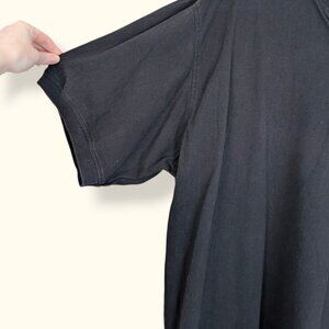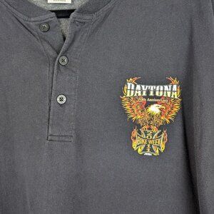 This t-shirt from Daytona Bike Week 2011 (made by Joe Boxer) is made of 100% cotton and is black with short sleeves. The shirt has a v neckline with a 3-button opening and has a large graphic across the back. The graphic features an eagle with its wings up, perched on a shape that is regrettably similar to an iron cross (a biker version apparently, not a racist version) that says, "BIKE WEEK 2011". There are flames in the background and across the top it says "DAYTONA 70TH ANNIVERSARY". The same graphic is found on the front, but it's much smaller and only on the left chest. The shirt has normal wear, including some fading of the dye in the fabric, but no issues affecting wearability.