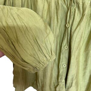 Lovely green Dazy blouse. Button front. Lacy neck detailing. Puffy Sleeves with elastic in the cuff. Fabric is crinkled.