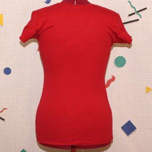 Officially licensed Deadpool red tee. Features a graphic of Deadpool saying: "Hey, look. It's my head." Never worn, washed once. I would have kept it if it wasn't for the placement of the eyes making the fit look so weird in my non-average body type. Made in Mexico. 100% cotton. Measurements lying flat are: 16"(32") bust, 16"(32") waist, and 18½"(37") hips. Fabric has a 35% stretch limit. Comes from a smoke-free home that has cats and dogs. Tags: fandom, comics, marvel, superheroes
