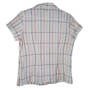 This striped short sleeve blouse, featuring a button-down front with ruffle detailing, offers a stylish yet professional look for work or casual outings.