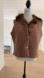 Deborah Murray faux suede vest has a faux fur lining. It has a faux fur collar lapel. Does up with 2 ornate silver tone buttons. The faux suede is a tan brown colour and the faux fur is in shades of brown. There is contrasting blanket stitching around the arm holes and down the front. 78% acrylic/28% polyester blend. Made in Canada.