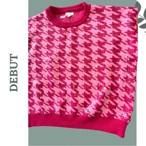 Elevate your style with the Debut pink Houndstooth Sweater with sequins on the sleeves and front of sweater. . This chic piece features a classic pattern and a vibrant pink hue, perfect for any occasion.