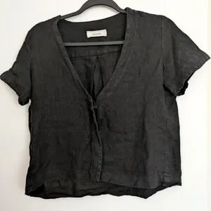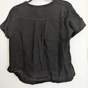 100% linen, PTP is 22.5", shoulder to hem is 18".