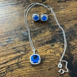 This stunning jewelry set features a silver chain with a striking blue pendant and matching earrings. Perfect for adding a touch of elegance to any outfit.