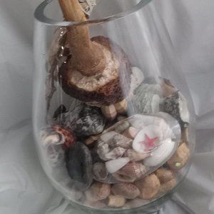 The design includes dry banana leaves, colored small stones and other kinds of stones, sea muscles, glass-like crystal