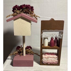 This charming set includes a decorative miniature birdhouse adorned with flowers and a miniature bathroom shelf with toiletries. Ideal for dollhouse enthusiasts or collectors, these detailed pieces bring a quaint touch to any collection. Both pieces showcase intricate craftsmanship and a delightful color palette.