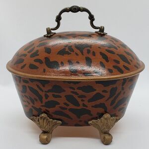 Decorative Vintage Leopard Wooden Vanity/Storage Box with Ornate Feet. Made in China. Condition is "PRE-OWNED and LIGHTLY USED". Approx. size: 7.25 in (w) x 9 in (L) x 7.75 in (H) with a tiny chip on rim at top of base and light scratch on top of lid. Given the age of this piece, the condition is amazing and the colour/pattern is very pleasing to the eye.