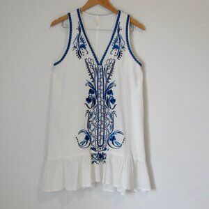 Dee Elly Dress Path to Paradise Blue White Embroidered Sleeveless Ruffle Medium