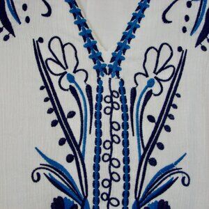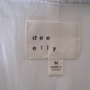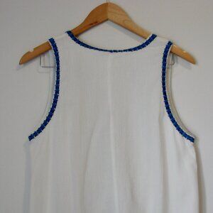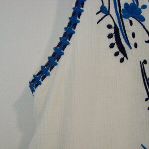 Dee Elly Dress Path to Paradise Blue White Embroidered Sleeveless Ruffle ~ Size Medium ~ 100% Rayon, Lining: 100% Rayon