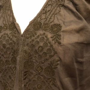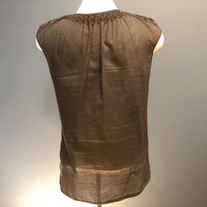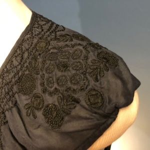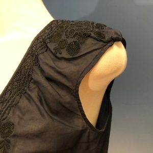 Navy tank top - 100% cotton with black embroidery. The cotton is soft and light weight and almost sheer. It has teeny white mark at the back hem of left sleeve. It is likely unnoticeable.