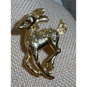 Deer Brooch Pin Animal Jewelry Vintage Gold Tone Bambi Fawn Rhinestone 1.5"