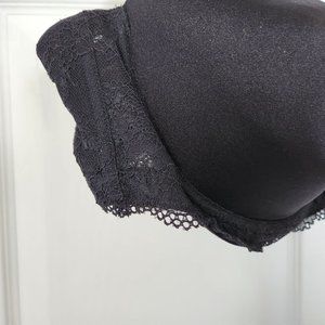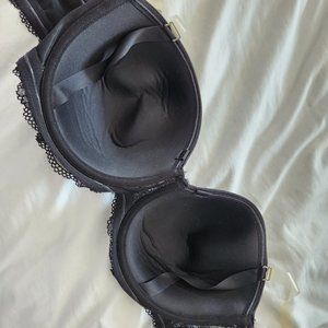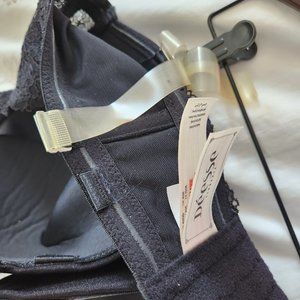 Black lace Deesse bra with removable clear straps. Can be criss-cross or moved closer or further apart on shoulders. Very supportive and softly padded. Great for off shoulder blouses or dresses. Smooth no seam cups for under tighter top.