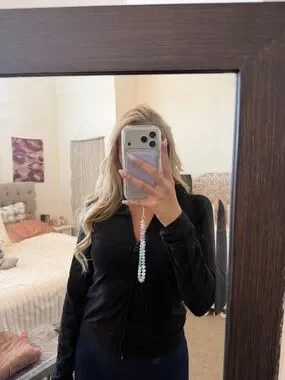 Size 6. Between crop and full length. Older style os define black lululemon jacket. Full-zip front with a fitted silhouette. Long sleeves for added coverage. Smooth, versatile athletic fabric. Great for layering or everyday wear.
