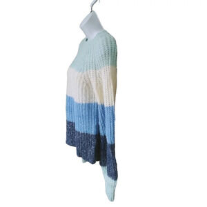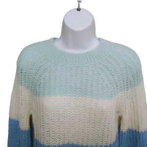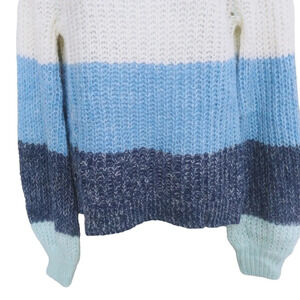 Chunky, oversized, slightly cropped ribbed knit sweater. Four large color blocked stripes - pale aqua, white, blue and dark blue. Dropped shoulder seam.