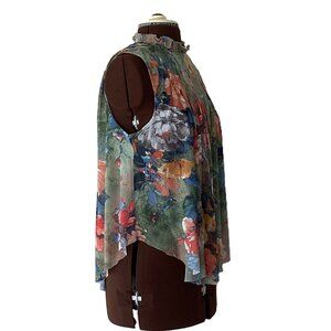 Romantic floral pullover sleeveless top with ruffled neckline, smocked front and raw edge contoured hi-low hemline. Top is lined. Great on its own or as a layering piece.