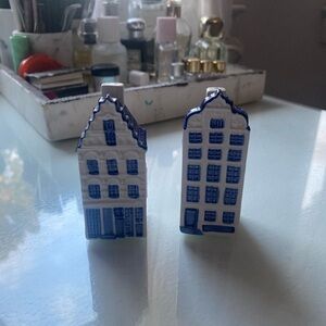 Charming ceramic house figurines in blue and white. Perfect for decor or collection.