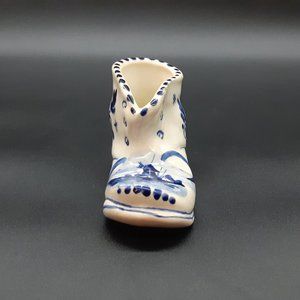 This is a Delft ceramic clog or shoe made in Holland; the mark on the underside says "Delft Holland."t is decorated with floral and leaf designs along with a windmill in front. There are no cracks or chips but it does have crazing.