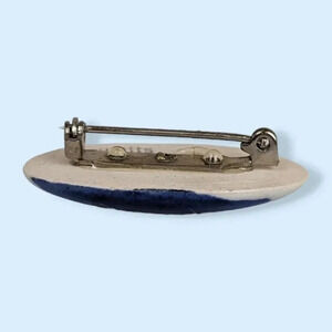 This little porcelain brooch is a smooth little oval with a flat back. It is white and has a tiny blue sailboat scene painted on it. There is a modern c locking pin closure and the piece is stamped delfts on the back.