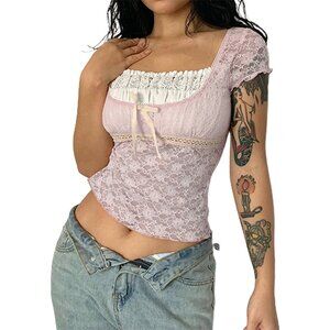 Slightly cropped tee made of synthetic pink lace, with a lined bustline which serves as a layered-look. Including a picture of a similar style, but not identical.
