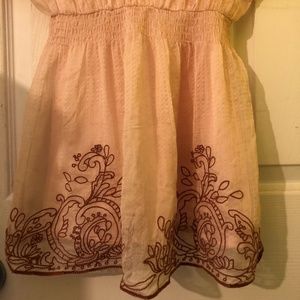 This top is aery and feminine. It has embroidery around the collar, the sleeves and the hem. The pink camisole under comes with it