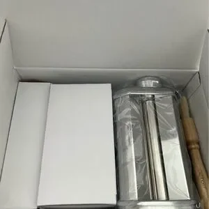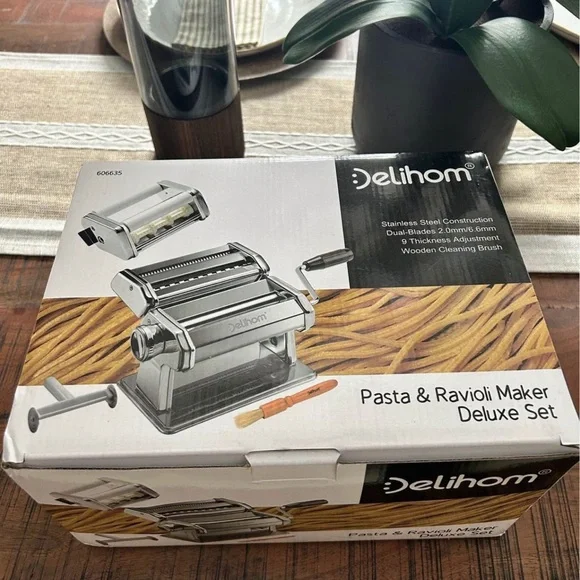 Pasta making machine, ravioli attachment, noodle cutter, dough cutter, table clamp, hand crank, wooden clean brush and instruction manual